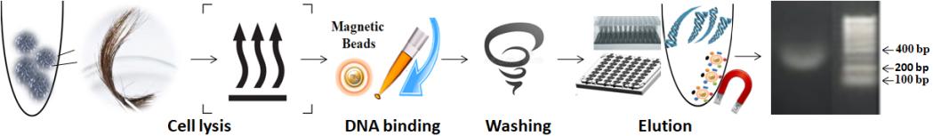 DNA提取是發(fā)干法醫(yī)分析的第一步。在一根無根毛發(fā)中只能提取出皮克級(jí)別的超短DNA片段。由于實(shí)際問題和技術(shù)原因,使用不同的提取方法,優(yōu)化條件從不同樣品中,最大程度的提高收集DNA的產(chǎn)量和純度至關(guān)重要。因此,尋找一種高效、穩(wěn)定和簡單的提取DNA和擴(kuò)增nuDNA靶點(diǎn)的技術(shù)是毛干DNA提取和擴(kuò)增的主要挑戰(zhàn)。因此,研發(fā)出一種從發(fā)干中提取DNA并且能去除DNA污染的簡單方法,同時(shí)可以顯著縮短分析時(shí)間,這對(duì)法醫(yī)和人口研究是很有價(jià)值的。