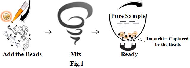 該方案操作簡(jiǎn)單:僅需一管,一步,一分鐘(圖1)。將磁珠直接添加到待純化的DNA/RNA樣品中,通過(guò)渦旋或移液以捕獲和去除雜質(zhì)。渦旋/移液后,磁珠被磁力架捕獲,而上清液中含有純化的,可進(jìn)行下有反應(yīng)的樣品。磁珠適用于DNA/RNA片段,質(zhì)粒DNA和基因組DNA。