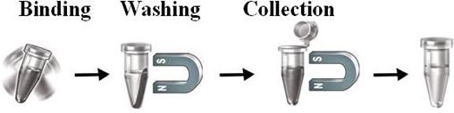 BcMag? IDA磁珠可以完美地作為親和樹脂進行親和純化,將分子、細胞和部分細胞提取物進行提煉純化。在與配體結合后,將磁珠添加到含有目標分子的樣品中,然后混合、孵育、洗滌和洗脫目標分子(圖2)。