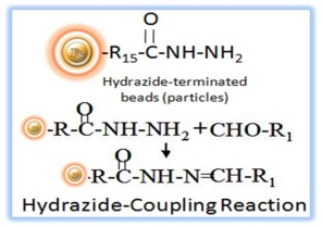 BcMag ? 酰肼基磁珠是在表面連接有高密度酰肼官能團的均勻磁珠。酰肼基磁珠可通過糖基化位點可有效的對糖蛋白進行標記、固定或偶聯;這些位點通常(與大多數多克隆抗體一樣)遠離關鍵結合位點的結構部位,這樣就完美的保留了這些關鍵結合位點的功能。以這種選擇性地與靶向分子Fc部分的重鏈結合的方式偶聯抗體,有助于Fv區域末端盡可能最好地保存抗原結合活性。在pH 5至7條件下,酰肼基的載體和化合物將與氧化碳水化合物的羰基結合,從而產生腙鍵(圖1)。酰肼基磁珠結合較大的糖蛋白和糖脂,碳水化合物或其他配體。它的親水性表面基團保證了磁珠在實驗過程中,具有極低的非特異性吸附率、且有良好的分散性,并易于在各種緩沖液中處理。
