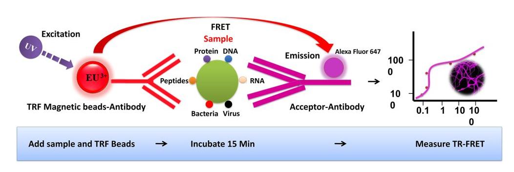 BcMag? TR-FRET測定方法與傳統的FRET(F?rster共振能量轉移)測定方法不同,它利用時間分辨熒光磁珠(BcMag? TR-Magnetic Beads)作為熒光供體團。供體和受體可以是兩個蛋白質、兩個DNA鏈、抗原、抗體或配體或其它受體。在一定的時間延遲后(通常為50至100秒),當供體和受體分子靠近并以時間分辨方式進行監測時,通過熒光共振能量轉移產生信號。在BcMag? TR-FRET測定方法中,微量的分析物可以通過時間分辨磁珠輕松地從樣品中富集,從而提高靈敏度。該測定方法消除了由樣品和塑料微孔板引起的所有熒光背景影響,以及直接激發受體所產生的背景影響。因此,BcMag? TR-FRET測定方法的信噪比非常高,背景值非常低。此外,該測定方法不需要清洗步驟。BcMag? TR-FRET測定方法在高通量篩選的生物分析中具有顯著的優勢,如測定靈活性、可靠性、提高測定靈敏度、更高的通量和更少的假陽性/假陰性結果。