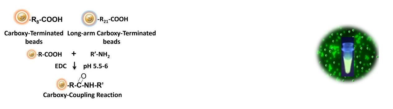 BcMag?羧基鋱熒光磁性微珠(圖1)是一種表面連接有高密度羧基功能團的時分辨熒光磁性微球。EDC和其他碳二亞胺是零長度交聯劑,可使羧酸鹽(-COOH)直接與伯胺(-NH2)結合,而不會成為目標分子之間最終交聯(酰胺鍵)的一部分。這些磁珠結合了預活化的羧基活性基團、時間分辨熒光染料和磁力特性的優勢,可以進行非常敏感的分析。磁珠的制造采用了納米級超順磁性氧化鐵和鋱金屬作為核心,并完全封裝在高純度二氧化硅外殼中,確保不會出現氧化鐵和鋱金屬的溶出問題。